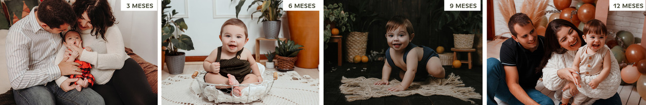 Retratamos de forma divertida e criativa o momento que o bebê começa a sentar, andar, primeiro dentinho e outros detalhes importantes e emocionantes de cada fase.